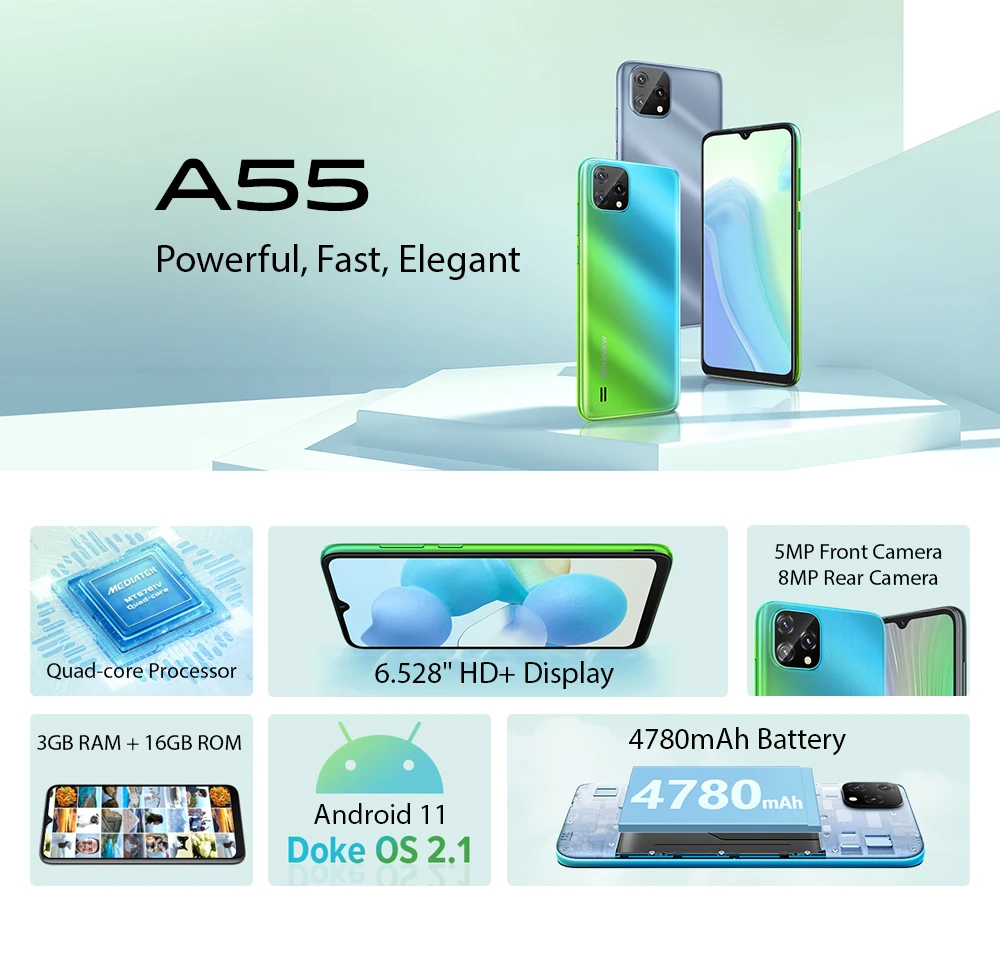Product Name: Blackview Nowy A55 Smartfon 3GB 16GB 6.528 "HD 4780mAh Czterordzeniowy Android11 Telefon Komórkowy MT6761V 5MP + 8MP Aparat W Telefonie Komórkowym